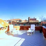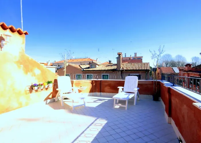 2-slaapkamer Terrazza Biennale Appartement ligt op 5 minuten rijden van de Rialtobrug. Dit appartement van 110 m^2 is voorzien van een terras met uitzicht op de tuin